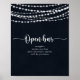 Esta corda rústica ilumina o sinal de bar aberto do casamento é perfeito para um simples casamento. O design apresenta belas luzes de cordas pintadas manualmente em um fundo azul escuro.
