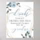 Dusty Blue Floral para combinar com o tema do seu casamento, Sinalização de Bar Aberta Engraçado para a sua recepção - As Bebidas de Hoje são Gratuitas, as Histórias de amanhã serão inestimáveis! . Rosas de aquarelas, folhas e bagas em azul-poeirento moderno rodeiam uma estrutura de ouro do estilo terrário geométrico com verde-sábio. Personalizar texto, estilo de fonte, cor e tamanho. Arte original criada para o BarefootBride™ por © WhimsicalArtwork™ - Esta é parte de um Conjunto completo de Artes de Casamento, chá de fraldas e outros artigos de papelaria para eventos semelhantes.