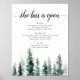 Convide os convidados a pegar uma libação favorita do bar com o nosso carinhoso cartaz de cardápio de bar de casamento. O poster 11x14 apresenta uma borda inferior de pinheiros com aquarela em tons ricos de caçador e verde florestal, com "o bar está aberto" em scripts de caligrafia fora do preto e letra de bloco. Personalize com suas seleções de vinho, cerveja e bebidas espirituosas embaixo. Concebido para corresponder à nossa coleção de lenhosas para o outono ou casamentos no inverno em ambientes florestais ou florestais.