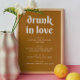 Coloque o tom com este sinal de bar de casamento que inclui a manchete lúdica "bebado no amor" contra um fundo marrom-mostarda rico. O layout minimalista e a tipografia ousada criam um olhar moderno, mas sutil, que se emparelha maravilhosamente com casamentos de outono, outono, rústicos ou de vassoura. Sua paleta de cores quentes adiciona profundidade e caráter ao decoro do bar. Esta design também complementa tons amarelos de ocre, fazer versátil para os estilos de casamento da moda e do eterno. Disponível como sinal impresso ou download digital.