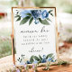 Este modelo de placa de bar mimosa apresenta florais azuis empoeirados e marinhos de aquarela emparelhados com uma fonte elegante de script. Edite facilmente o texto *maioria* para corresponder ao seu evento.