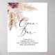 Este sinal de barra aberta com grama de Pampas boho é perfeito para um casamento de verão. O design de aquarela floral apresenta flores boêmias em burgundy e rosa beije com raminhos de grama de Pampas neutra e folhas de palmeira secas douradas.