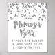 Cartaz de sinal de barra de Mimosa para casamento em padrão de confetes branco e prateado com letras em estilo manuscrito. Perfeito para casamentos ou chá de noiva.