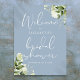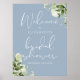 Este sinal de boas-vindas para chá de noiva botânico elegante em azul poeirento pode ser personalizado com suas informações em tipografia chic. Criado por Thisisnotme©