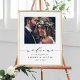 Sinal moderno de boas-vindas ao casamento (poster) com na moda caligrafia e fotografia. Para personalização mais avançada deste design, clique no link Personalizar Mais para alterar a fonte, o tamanho e a cor.