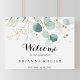 Este robusto sinal de boas-vindas florais de ouro eucalipto é perfeito para um casamento simples. Este design artístico apresenta folhagem verde de ouro desenhado à mão e cor d'água eucalipto, inspiradora beleza natural. Faça esta poster com o nome da noiva e do noivo, e a data do casamento.