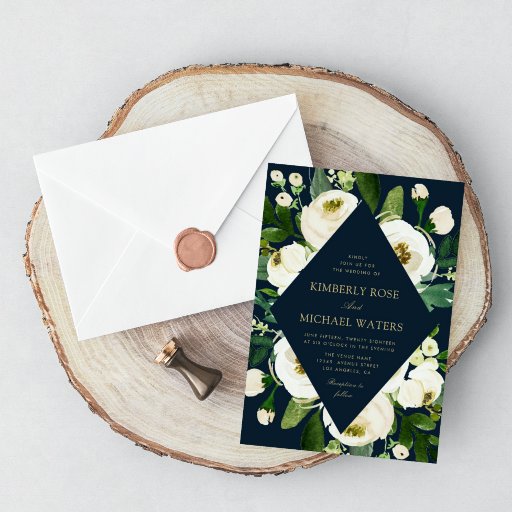 Um tema verde adorável com flores brancas de marfim de aquarela e folhagem verde. O texto e a cor azul escura podem ser personalizados.