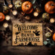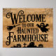 Um boato de boas-vindas ao nosso cartaz da Casa Farmada com cemitério, teia aranha, fantasma e silhuetas de vassoura sobre um fundo de madeira desbotada