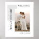 Um design simples que é fácil de personalizar e que seus hóspedes vão amar! Adicione sua foto vertical favorita a este sinal de boas-vindas do casamento. A seguir, você vai personalizar com seus primeiros nomes. Por fim, adicione a data. Acabou de criar o seu único sinal de boas-vindas fotográfico para o seu casamento. Coloque isso em uma posição proeminente onde os convidados podem facilmente vê-lo. Este tem um retângulo de cinza que coordena com a foto. Se quiser outra cor, você pode fazer isso no menu editar. Ou, em alternativa, entre em contato com o designer que pode mudar a cor para você.