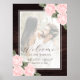 Elegante rustic blush floral placa de boas-vindas a fotos de casamento floral com rosas rosa-pinceladas e hálito de bebê enquadrando os detalhes do casamento e uma foto contra um fundo de madeira rústica. Itens correspondentes disponíveis.