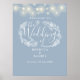 Com luzes de cordas bonito, este sinal de boas-vindas florais de na moda pode ser personalizado com suas informações em caracteres chicos em um fundo azul empoeirado. Projetado por Thisnotme©