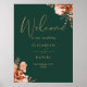 Este elegante sinal de boas-vindas de casamento floral rústico pode ser personalizado com suas informações em tipografia dourada elegante em um fundo verde esmeralda. Criado por Thisisnotme©