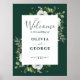 Este sinal de boas-vindas de casamento floral botânico verde esmeralda elegante pode ser personalizado com suas informações em tipografia moderna. Criado por Thisisnotme©