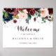 Esta placa de boas-vindas ilustrada com aquarela é perfeita para um simples casamento. A design apresenta marinho de aquarela pintada à mão artística azul, burgundy, vermelha, rosas de pincel e peônias com folhas verdes elegantes, inspirando a colorida beleza do outono idílico. Faça esta poster com o nome da noiva e do noivo, e a data do casamento.