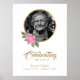 Elegante sinal de boas-vindas de funeral rosa e dourado com uma moldura de foto dourada adornada com rosas rosa.