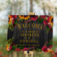 Casa russa personalizada: poster de boas-vindas para o casamento da fazenda rural, com belos girassóis de ouro amarelo e buquês de rosas de burgundy com folhagem verde natural sobre um fundo de madeira marrom-escura. ++++++++++++++ Fácil de personalizar com os nomes da noiva e do noivo, data e local. +++++++++++++ Adequado para cerimônias e recepções de casamentos no jardim ou no outono ao ar livre.