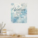 Bem-vindos convidados com esta elegante placa de casamento no inverno em azul empoeirado. Apresentando delicados flocos de neve com aquarela, coração romântico com corda prateada e caligrafia moderna, esta design dá o tom para uma celebração sonhadora do inverno. Totalmente personalizável com nomes e data de casamento — perfeito para cerimônias de neve, locais de alojamento ou casamentos de férias.