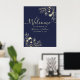 Bem-vindos aos seus convidados no estilo do eterno com este elegante cartaz azul de casamento, com sotaques florais de ouro delicados e caligrafia romântica. Uma peça de entrada perfeita para a sua celebração sofisticada.