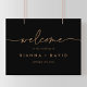 Este símbolo de boas-vindas clássico de ouro negro é perfeito para um casamento moderno. O design simples e elegante apresenta a tipografia clássica e de rico em ouro. Faça esta poster com o nome da noiva e do noivo, e a data do casamento.