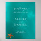 O moderno roteiro elegante de tipografia do casamento imprimível sinal de boas-vindas poster em aqua teal turquoise com sombras de água e estrelas-do-mar. +++++ Perfeito para uma praia de moda, mar, oceanfront, litoral, tropical, náutica, ilha ou cruzeiro com destino temático. O convite de correspondência, o envelope, o RSVP e os cartões de inserção estão disponíveis na coleção.