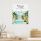 Esta elegante e bela placa de boas-vindas do casamento em aquarela apresenta uma praia, céu azul e palmeiras. O texto combina o script manuscrito e as fontes sans serif para uma aparência na moda e moderna. Isto é perfeito para uma praia de verão ou um casamento de destino tropical.