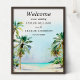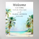 Esta elegante e bela placa de boas-vindas do casamento em aquarela apresenta uma praia, céu azul e palmeiras. O texto combina o script manuscrito e as fontes sans serif para uma aparência na moda e moderna. Isto é perfeito para uma praia de verão ou um casamento de destino tropical.