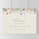 Este sinal de boas-vindas de flores silvestres radiantes é perfeito para um casamento rústico. O design apresenta flores cor-de-rosa, roxa, esbranquiçada, amarela, marinho azul, verdes e campo selvagem reunidas em buquês florais sem costura e deliciosos, evocando a beleza natural. Faça esta poster com o nome da noiva e do noivo, e a data do casamento.