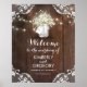 Madeira de celeiro, rendas, luzes de cordas e jarro de pedras com flores de hálito de bebê sinal de boas-vindas de casamento poster