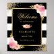 O símbolo elegante de boas-vindas florais, preto e branco, listrado, com cor d'água, cor rosa pincelada, cor de pêssego e flores de marfim, e verde dourado, preparando os detalhes do casamento. Itens correspondentes disponíveis.