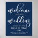 Sinal de casamento na moda com caligrafia branca moderna sobre fundo azul marinho. Este design está disponível em uma variedade de cores e estilo de script.