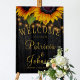 O na moda elegante sinal de boas-vindas poster casamento outono na madeira marrom-escura como fundo com grandes girassóis ouros amarelos, cordas de luzes quentes cintilantes e um roteiro de tipografia de ouro falsa e editável para rico. ++++++++++++++ Personalize-o com seus detalhes! Você pode personalizá-lo alterando ainda mais as fontes e as cores das letras. +++++++++++++++ É adequado para a elegante noite de verão ou outono/jardim russo do país/casamentos no exterior.