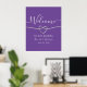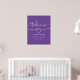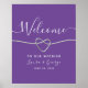 Saudações aos seus convidados com este elegante sinal de boas-vindas ao casamento roxo, com um fundo violeta profundo, coração romântico de corda prateada e caligrafia sofisticada. Uma primeira impressão perfeita para sua cerimônia ou recepção, dando um tom na moda e sincero para seu dia especial.