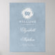 Dusty azul elegante sinal de boas-vindas de casamento com poster com o monograma da coroa floral do hálito do bebê