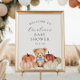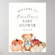 Bem-vindos convidados para a sua celebração com este charmoso sinal de chá de fraldas de ursinho de outono. Apresentando um doce ursinho de cor d'água cercado por abóboras em tons quentes de outono, este design é perfeito para adicionar um toque confortável e festivo ao seu evento. Personalize com o nome da futura mãe e os detalhes do chá para uma única manutenção que duplica como bela decoração. Ideal para chás de fraldas com temática de abóbora, celebrações de outono, ou chás de fraldas com tema de menino, este sinal cria a primeira impressão perfeita para os seus convidados.