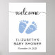 Poster de sinal de boas-vindas para o chá do seu bebê com "bem-vindo" em um roteiro bonito com pântanos e uma cor de água azul pastel dos pés do bebê. Personalize facilmente com seu nome e data de chá.