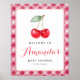 Um bom sinal de boas-vindas a um chá de fraldas, com tema cereja, com duas cerejas aquáticas enquadradas por uma borda cor-de-gingham rosa. Personalize com o nome do convidado de honra e a data do evento. Perfeito para cumprimentar convidados e amarrar seu tema de festa de cereja juntos.