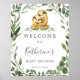 Bem-vindos aos seus convidados chás de fraldas com sinal de boas-vindas da família das preguiças, com cor d'água verde eucalipto garland. Personalize com seus detalhes de chá de fraldas em um layout simples e moderno e uma fonte elegante de estilo manuscrito.