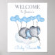Um sinal de boas-vindas que você pode personalizar para seu chá de fraldas. A design apresenta um elefante bebê tirando uma soneca em uma nuvem branca fluffy com balões azuis em forma de coração. A placa diz "Bem-vindo ao Chá de fraldas" em azul e cinza. Por favor, procure na nossa loja os sinais de coordenação para seu presente e favoreça as mesas.