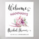 Sinal de boas-vindas do chá de panela que você pode personalizar com a noiva para ser o nome, a data e o local (ou seu texto personalizado). O design apresenta um arranjo floral de aquarela de lavandas, flores e folhagem, com letra escrita caligráfica e tipografia ousada moderna. Este sinal faz parte da nossa coleção de Lavandas e Lilacs - por favor, procure na nossa loja para coordenar convites e acessórios.
