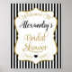 Um elegante sinal de boas-vindas do chá de panela, com listras brancas pretas e trim dourado com nome personalizado para a noiva a ser. Um bonito design de espiral de ouro com um coração no centro faz com que este chá de panela assine uma maneira adorável de apresentar os convidados ao seu chá de panela formal de casamento. Mais itens em preto e ouro podem ser encontrados no meu compro.