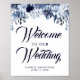 Um arranjo bonito de flores azuis e azuis profundas no topo deste sinal de boas-vindas ao casamento. Boas-vindas do casamento está escrito em uma dramática cor azul indigo. Os nomes dos casais de casamento e a data estão no fundo.