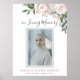 Este na moda funerário elegante símbolo de boas-vindas da Mulher elegante, com buquê pincelado rosas e flores rústicas, uma foto do seu ente querido em moldura de cinza escura, seu nome e datas de vida e texto em memória amorosa em fundo branco.