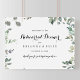 Este sinal verde de boas-vindas do janto de ensaio de eucalipto é perfeito para um ensaio de casamento moderno. A design apresenta um eucalipto elegante desenhado à mão por uma aquarela botânica, inspiradora beleza natural.
