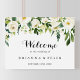 Este sinal de boas-vindas florais de outono verde é perfeito para um casamento rústico. O design apresenta elegantes pedras brancas de aquarela com folhagem verde. Faça esta poster com o nome da noiva e do noivo, e a data do casamento.