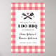 Bem-vindos convidados e o casal engajado com um sinal de poster de I Do CHURRASCO com uma alegria sobre o padrão clássico, vermelho, do cobertor de piquenique de gingham e ferramentas de grelhação com coração. Personalize o texto de acordo com as necessidades do seu partido com caixas de texto flexíveis ou mude ainda mais sobre o design usando o link personalizar mais.