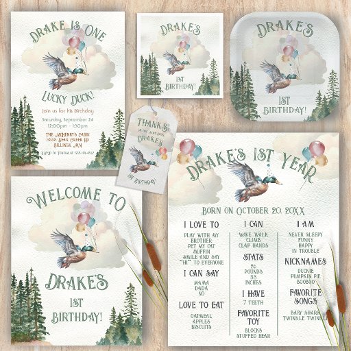 Festa de aniversário de "Pato Sortudo", charmosa e rústica cor d'água. Possui um pato-grande com chapéu de festa e balões voando através das nuvens para uma festa com fundo florestal. Excelente para um menino ou menina ou qualquer idade! Para fazer mais mudanças, vá para Personalizar este modelo. Na parte inferior você verá "Quer personalizar este design ainda mais? Clique em EDIT usando a ferramenta Design. Será necessário algum aprendizado, mas você pode mudar algumas das fontes e algumas cores, mover as coisas ou excluir o que você precisa.