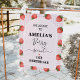 Primeiro aniversario rosa Gingham Berry Sweet Sinal de boas-vindas Moderno e doce rosa e vermelho nosso caramelo de primeira-vinda apresentando um padrão cor-de-rosa, morangos aquarelas, arco rosa e uma imagem de rumo da caligrafia moderna.