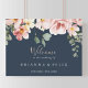 Este sinal de boas-vindas florais do rosa de jardim de eucalipto é perfeito para um casamento rústico. A design apresenta flores rosa, pinceladas, amarelas, com folhas de eucalipto em fundo azul-marinho escuro. Faça esta poster com o nome da noiva e do noivo, e a data do casamento.