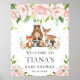 Personalize este sinal de boas-vindas da floresta floral cor-de-rosa com os detalhes da sua festa hoje! Basta pressionar o botão personalizar para reorganizar e formatar o estilo e o posicionamento dos textos. Apresentando lindos animais de floresta brancos e flores com cor d'água. Itens correspondentes disponíveis no repositório. (c) O feliz Cat Studio.
