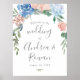 Sinais românticos de boas-vindas ao casamento floral desenhados com uma terra de flores azuis e rosa poeirentas.